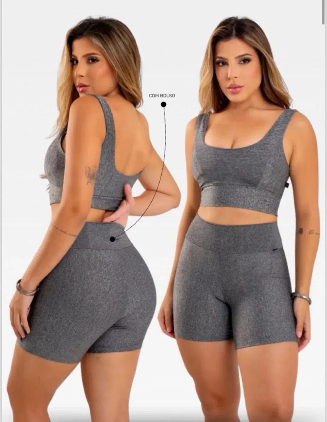 Top de alças largas e short cintura alta em tecido suplex elástico de alta compressão com toque macio: modela a silhueta, preserva a mobilidade, seca rápido e é durável.