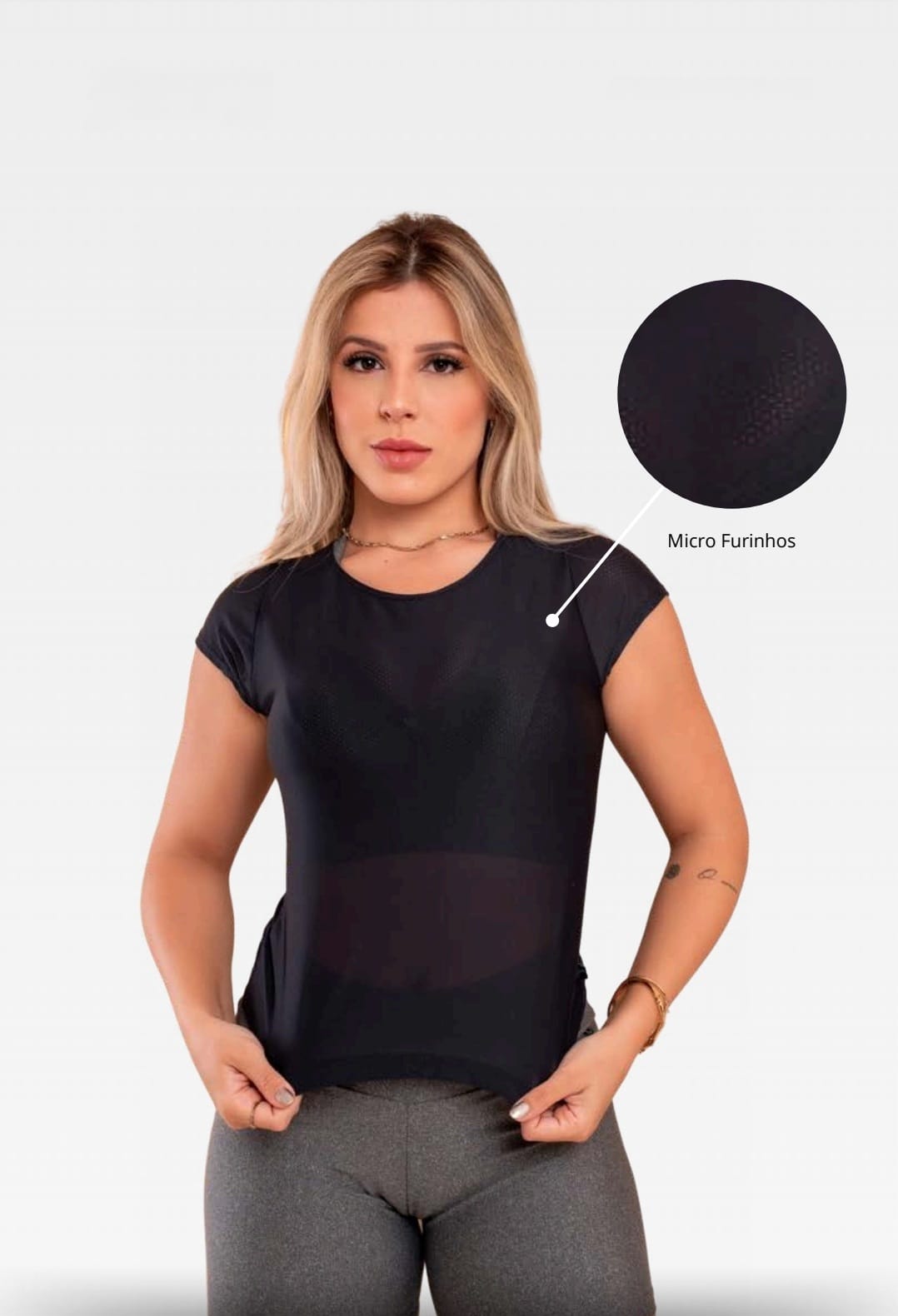 Os micro furos promovem ventilação constante, mantendo a pele seca e o corpo fresco em atividades cardio, força ou HIIT. Ideal para academia, yoga ou uso diário.